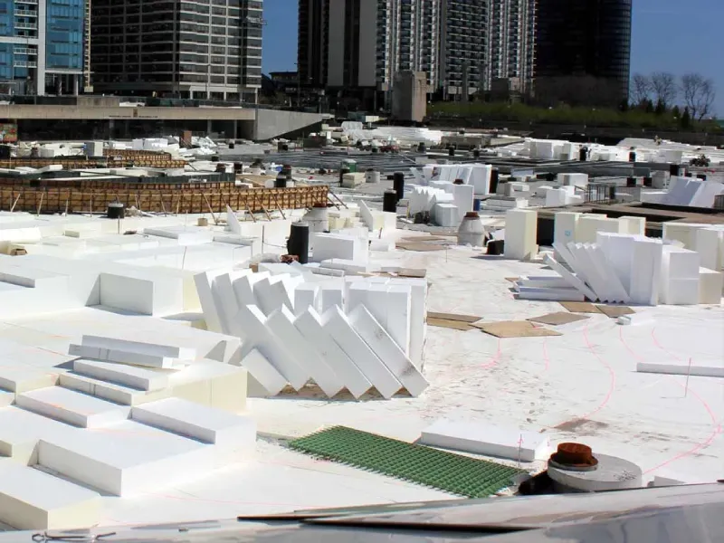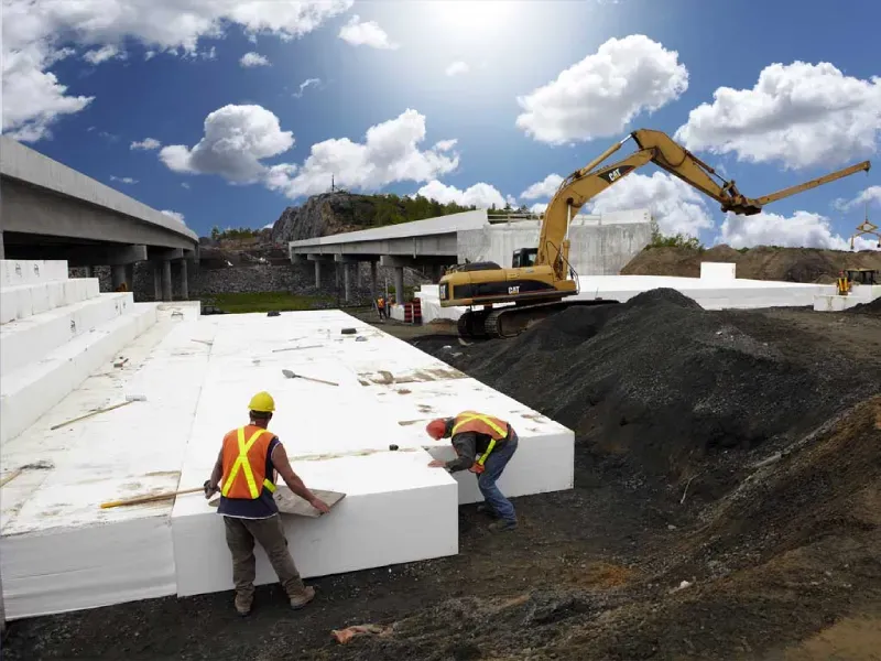 Na construção de rodovias em que são aplicadas o processo Geofoam, os blocos de EPS (isopor) são empilhados e cobertos por aterros laterais e pavimentação superior.